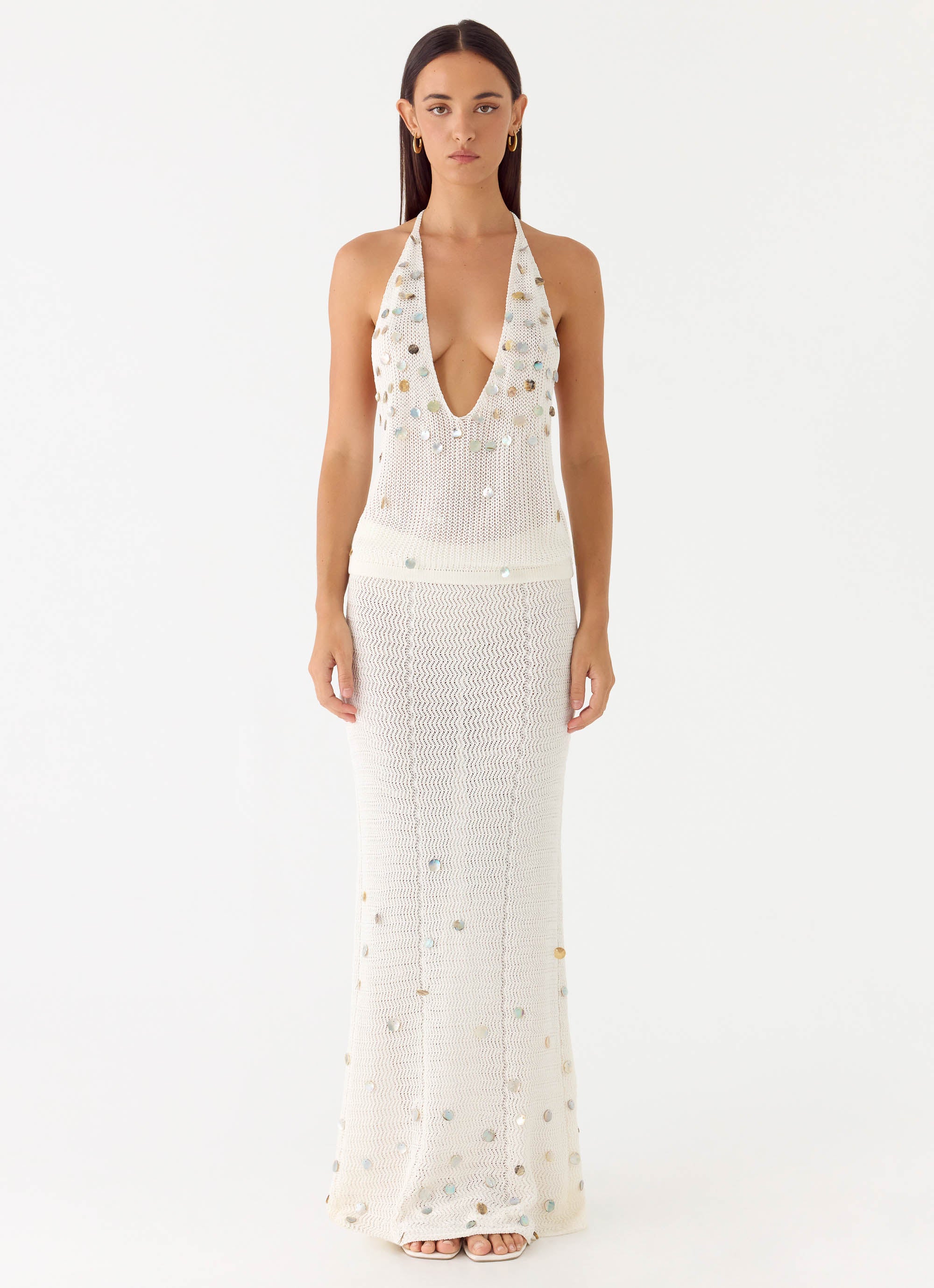 The Adelaida Beaded Crochet Top features a striking deep V - neckline and a sophisticated halter neck design. Crafted from intricate crochet with delicate beaded accents, this unlined silhouette offers a breezy, textural look that is perfect for pairing with your favourite high - waisted bottoms. It offers a bohemian - luxe feel for your next getaway.
