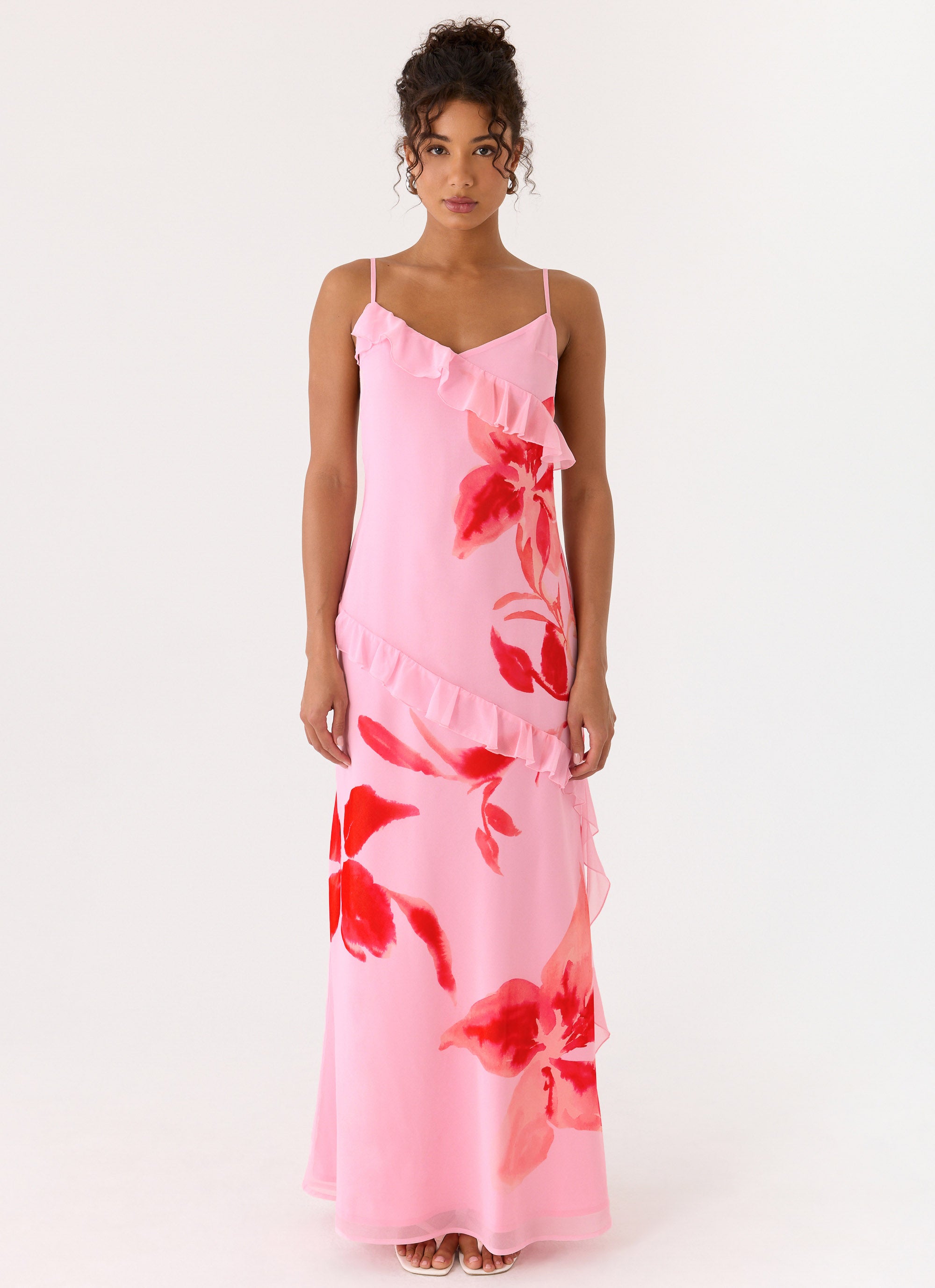 The Ayesha Maxi Dress is. Cut in a flowing maxi silhouette with adjustable shoulder straps, it features delicate frill detailing and a low back for effortless movement. Fully lined and crafted in lightweight chiffon with an exclusive print, each piece captures golden hour escapism with subtle, shifting patterns.