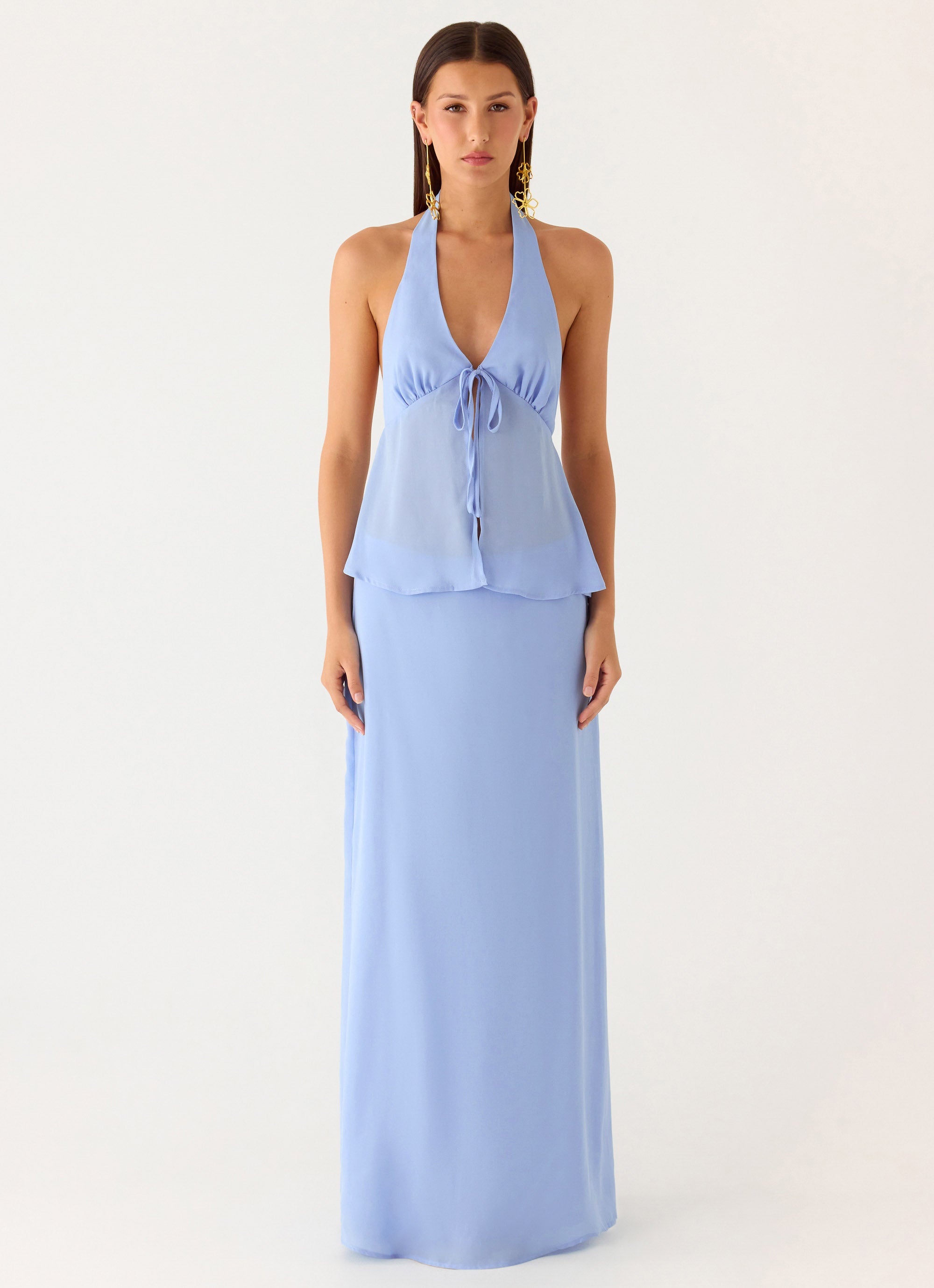 The Ashlea Tie Top is made for statement moments. Featuring a halter neckline with an adjustable front tie, this bustier-inspired style is fully lined with ruching for a flattering, body-hugging fit.