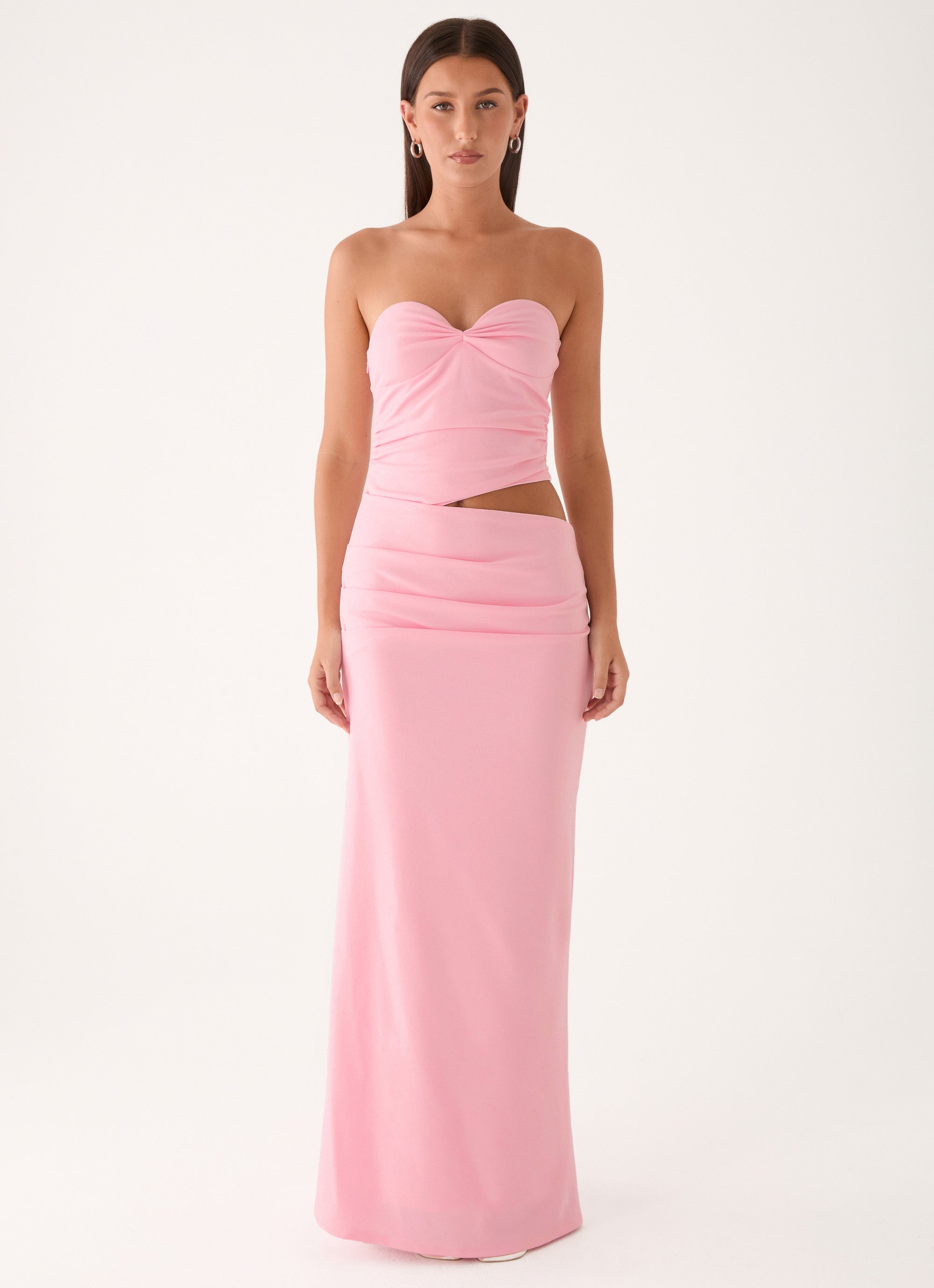 The Carella Strapless Maxi Dress is designed to elongate the silhouette with its floor-grazing length and sleek strapless neckline. Featuring a side cut-out and silicone elasticated tape for a secure fit, the stretch crepe fabrication hugs the body while allowing effortless movement. This long, fitted style combines bold structure with refined elegance.