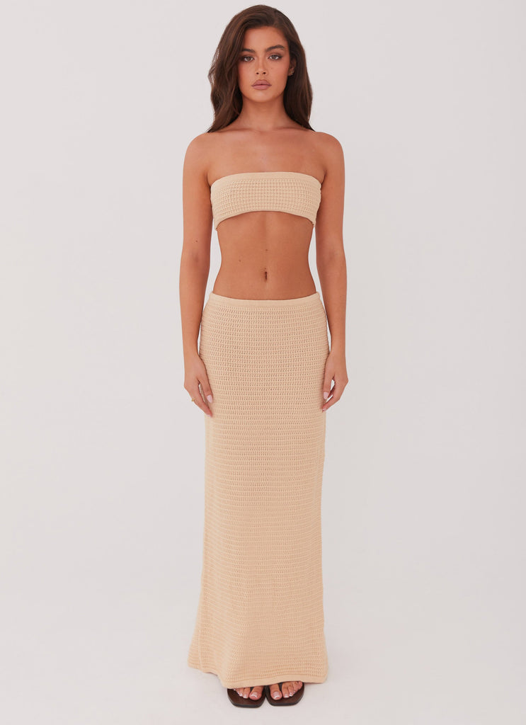 Embrace our Emaline Knit Bandeau Top. Crafted from a thick crochet fabric, this top exudes effortless elegance. Pair it with the Emaline Knit Maxi Skirt for a coordinated look that's perfect for golden skies, balmy nights, and the enchanting silhouettes of the nightclub scene.